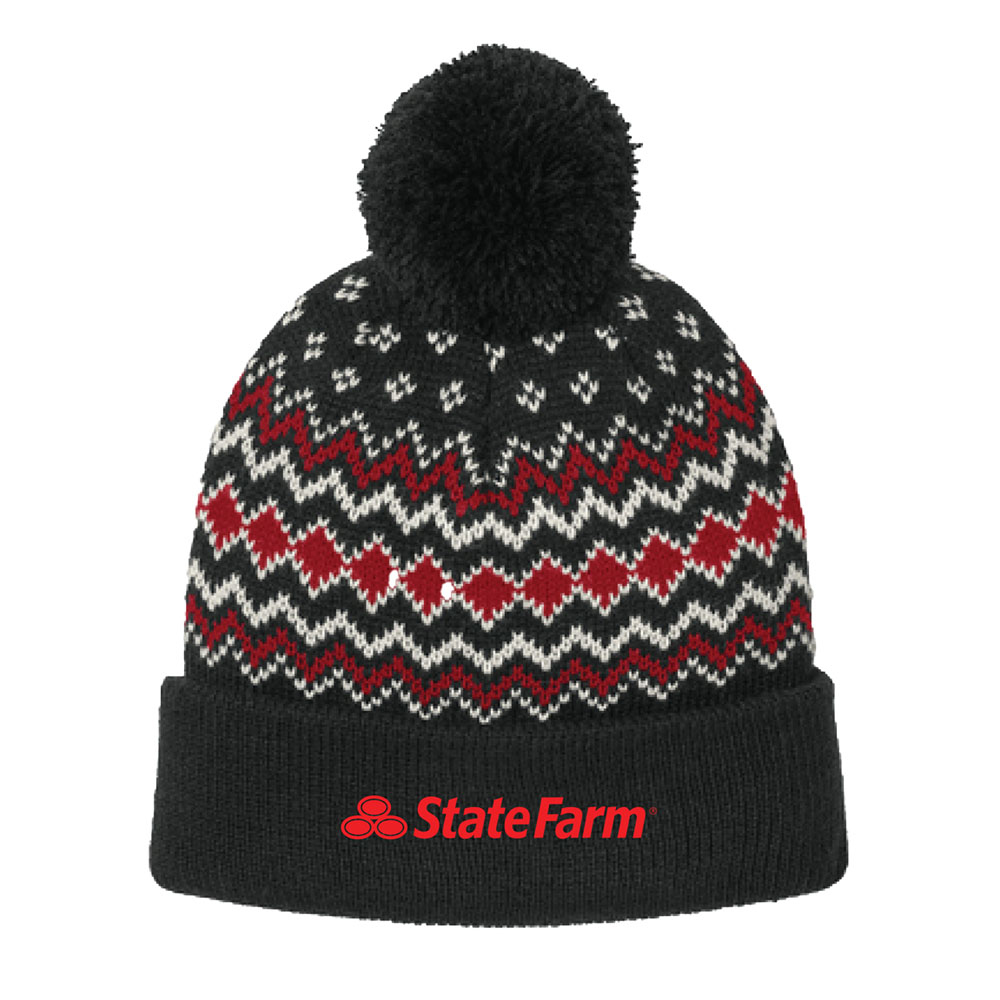 This beanie is embroidered with the red State Farm horizontal logo.