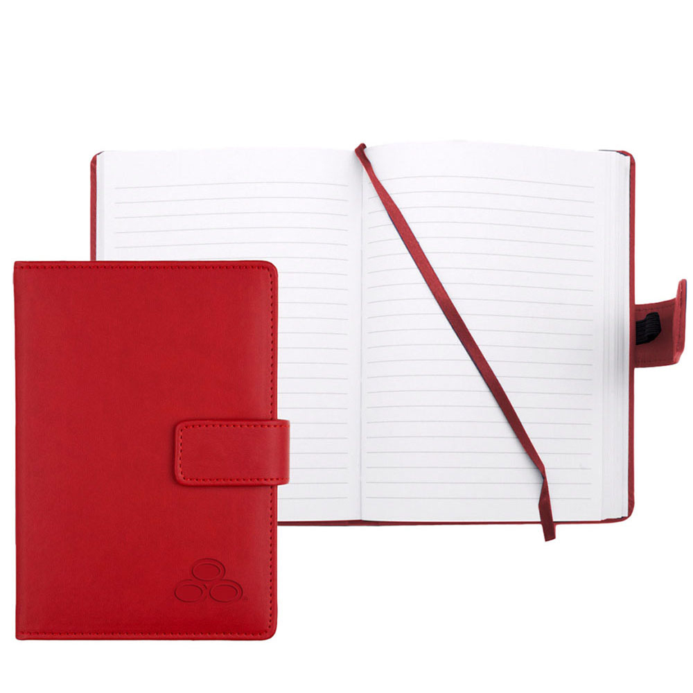 This handy 5" x 7" notebook has a soft faux-leather padded cover with matching stitching and 150 white lined sheets. It also features a ribbon bookmark, a back accordion pocket, an elastic pen loop (pen not included) and an exclusive "2 position" magnetic lappet closure. Each book comes individually gift boxed.